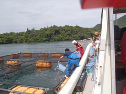 日中の炎天下の中、足場の狭い生簀の上での作業は大変でしたが、歩留り(生残率)も良く、例年通りマダイ放流が行えそうです。